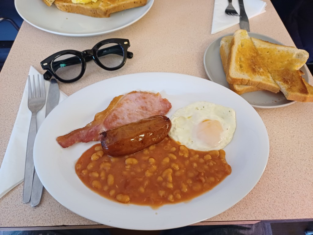Full English delivered: proper sausage, well-cooked bacon, runny eggs, generous beans, chips on the plate, toast on standby. My colleague’s chilli-cheese jacket potato looked like the kind of order you plan your return around.