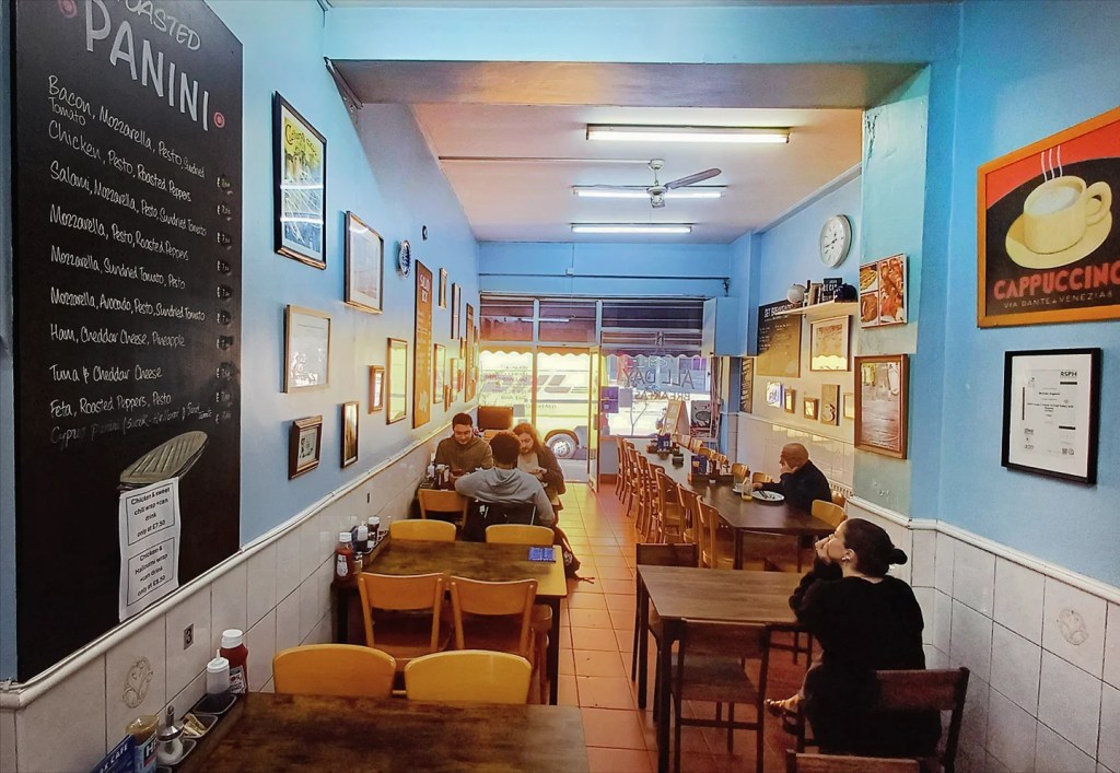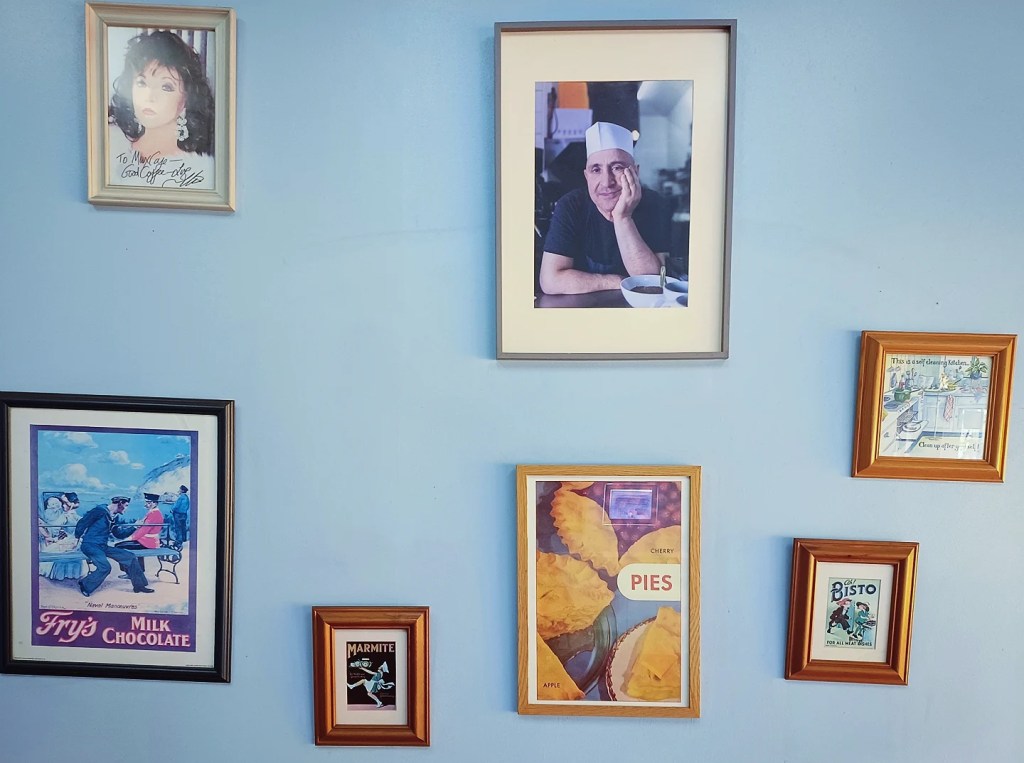 Some of the iconic blue Formica has gone, replaced by classic wooden tables. Still functional, still honest. Handwritten menu boards and wall mementoes marking years of service.