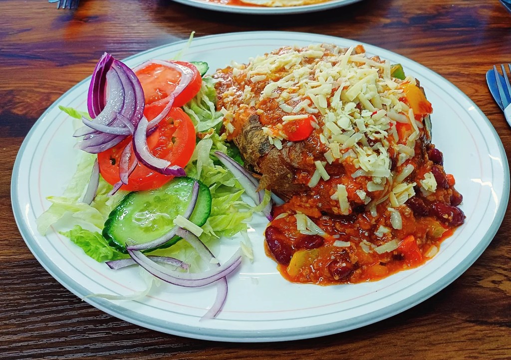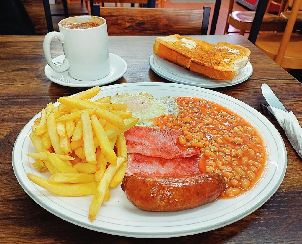Full English delivered: proper sausage, well-cooked bacon, runny eggs, generous beans, chips on the plate, toast on standby. My colleague’s chilli-cheese jacket potato looked like the kind of order you plan your return around.